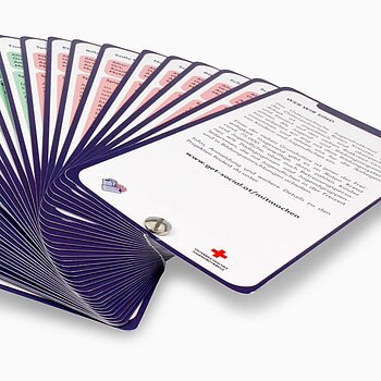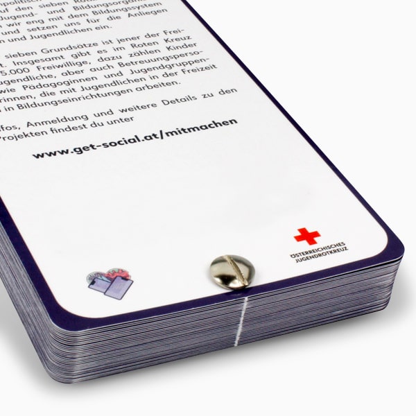 Der von Kip gedruckte Produktfächer mit 32 Blättern zeigt übersichtlich 60 kreative Spielideen, die bei verschiedenen Veranstaltungen, bei der sich die Jugend trifft, immer wieder zum Einsatz kommen. Kurz und knapp zeigt jede einzelne Seite des Fächers eine kurze Spielanleitung verschiedener Outdoorspiele, die Jungen wie Mädchen animieren sollen, miteinander zu agieren und Gemeinschaft und Teamgeist fördern sollen. Der Fächer wurde aus stabilem Karton hergestellt und für einen möglichst langen Einsatz mit einer beidseitigen Folienkaschierung versehen. Eine robuste drehbare Metallöse rundet dieses Produkt eindrucksvoll ab.