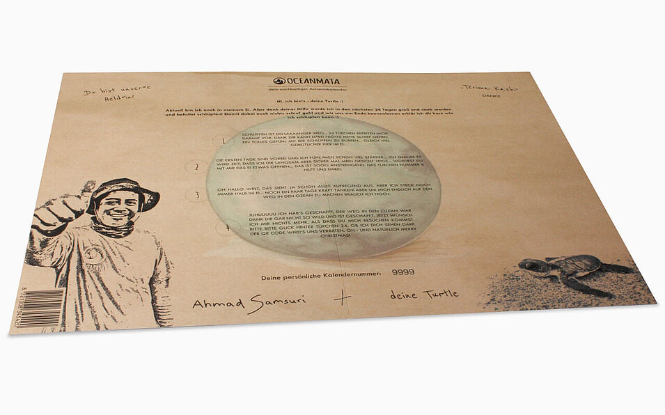 Auf den oberen Fotos erkennt man 25 angestanzte Türchen. Das 24. Türchen ist bewusst zweimal abgebildet! Der Spendenkalender wurde aus einem rauen Offsetkarton hergestellt und unterstreicht optisch wie haptisch perfekt den braunen Sandhintergrund. In der Mitte ist das Schildkrötenei abgebildet und wenn man Türchen 6, 12, 18 und 23 geöffnet hat, erscheint die geschlüpfte Meeresschildkröte. Auf der Kalenderrückseite ist eine kurze witzig geschriebene Anleitung abgebildet und man erkennt seine persönliche Kalendernummer. Türchenkalender dieser Art eignen sich perfekt für gemeinnützige, nachhaltige und soziale Spendenaktionen.