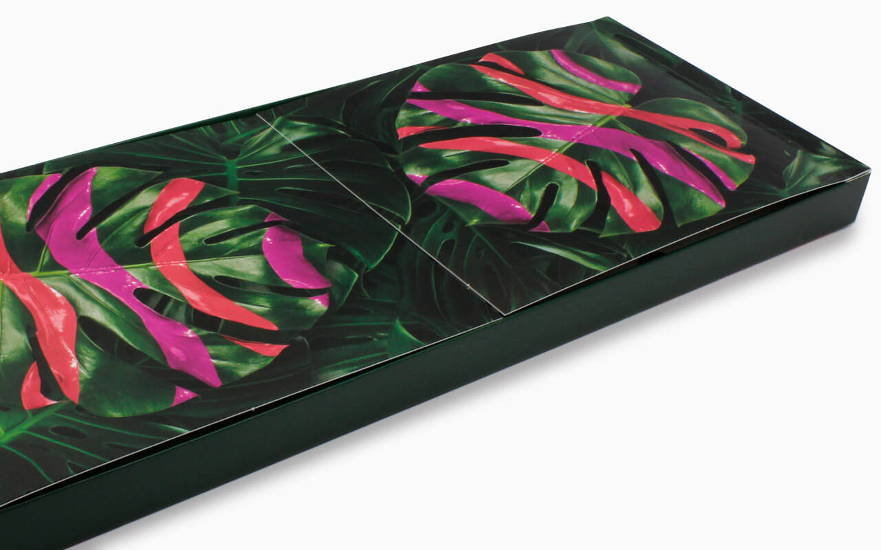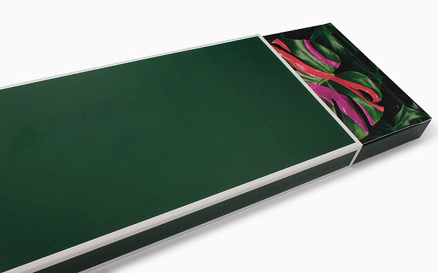 Die Veredelung Ihrer Schiebeschachteln verleiht der Verpackung den letzten Schliff. Wählen Sie aus unterschiedlichen Farben, von bunt über Schwarz bis hin zu Gold, Lackierungen und Kaschierfolien, nutzen Sie Stanzungen wie Fenster oder setzen Sie effektvolle Prägungen ein. Gemeinsam mit Ihnen erzielen wir eine optimale Wirkung Ihrer Verpackungslösung.